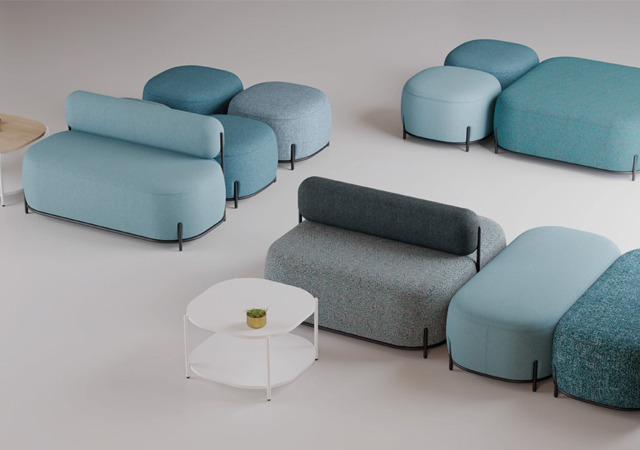 Una colección que se configura en modelo individual, doble y cuádruple, con o sin respaldo, con una amplia gama de opciones cromáticas en cuanto a tejidos disponibles, que se complementa con su mesa baja auxiliar.