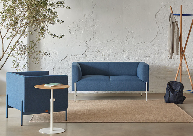 Un programa de sofás de una, dos y tres plazas con una detallada gama cromática de tejidos y con una estructura metálica que da luz, color y calor a áreas como hoteles y oficinas, zonaas comerciales y de rececpción y espera.